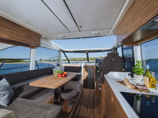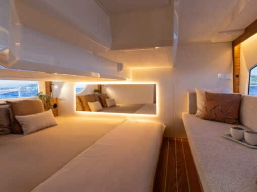 • Un design très contemporain et élégant, souligné par de larges hublots qui apportent beaucoup de lumière naturelle dans les différents espaces (cockpit, cabines et salle de bain)