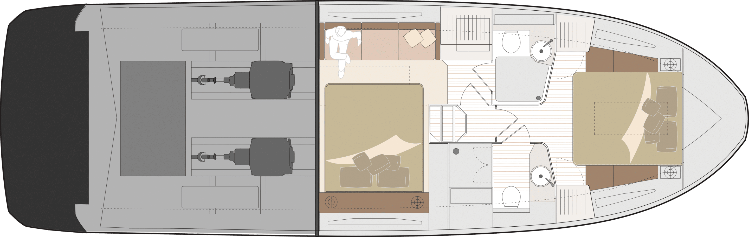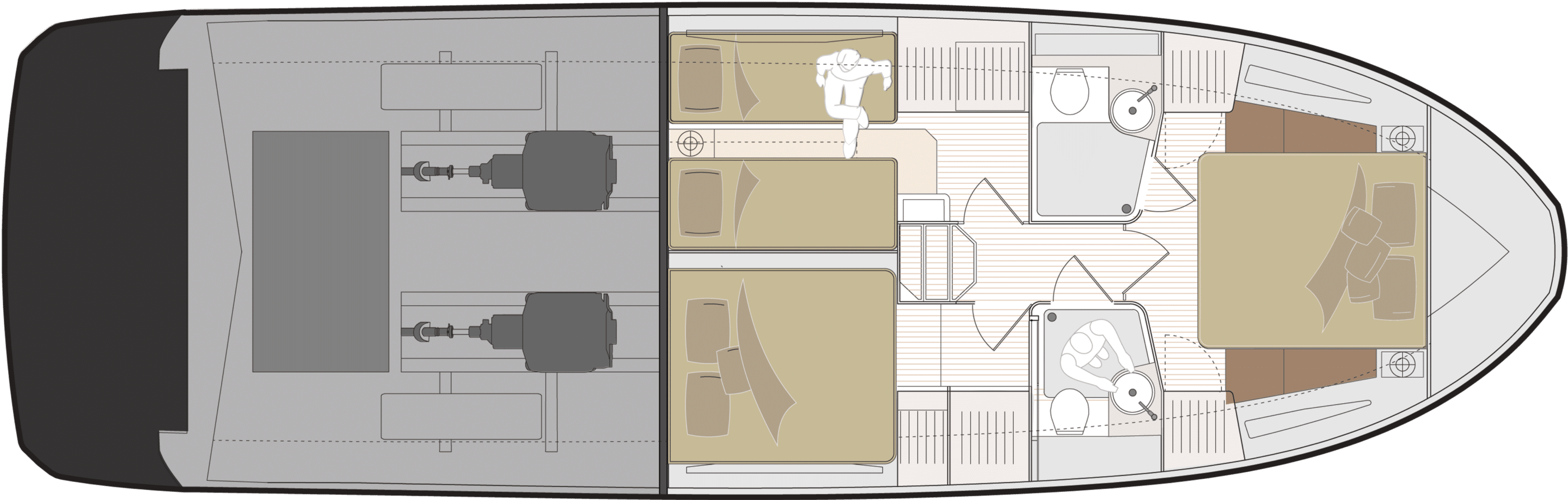 - Deux ou trois luxueuses cabines avec des volumes généreux et de nombreux rangements.